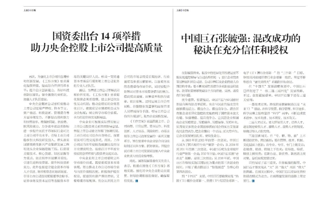 抚今追昔,张毓强说,中国巨石与中国建材的混合所有制改革证明,央企与民企的混改完全能够混出活力,混出合力,混出竞争力。混合所有制企业差异化管控的实施有利于国有资本放大功能、保值增值、提高竞争力,让民营企业和国有企业互相促进、互相提升、互相借鉴、互相补充,从而使更多的企业既能够拥有国企的实力又能兼有民企的活力,把企业推向一个更高、更大的平台,让企业发展更加扎实、更有生命力。