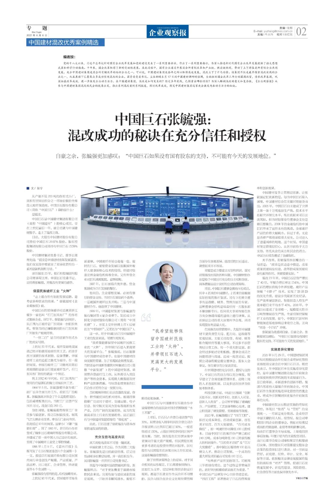 青青草视频 - 改革亲历者访谈 | 《企业观察报》专访中国巨石张毓强:混改成功的秘诀在充分信任和授权